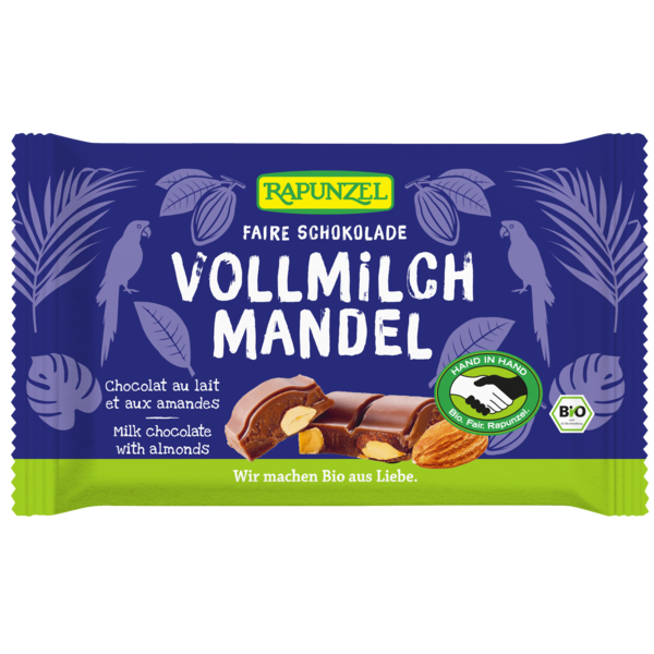 Ce chocolat au lait fondant avec des amandes croquantes est issu du programme HAND IN HAND de Rapunzel qui allie écologie et commerce équitable. Avec les matières premières de qualité, le conchage intensif est le véritable secret de ce délicieux chocolat. Grâce au conchage, les riches arômes cacaotés se libèrent petit à petit jusqu'à leur plein épanouissement. Et toute la subtilité et le fondant incomparable du chocolat se dévoilent.