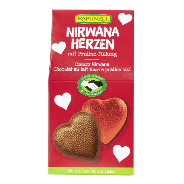 Coeurs fondants en chocolat avec un subtil fourrage praliné. Produit issu du programme HAND IN HAND de Rapunzel qui allie écologie et commerce équitable. Avec les matières premières de qualité, le conchage intensif est le véritable secret de ce délicieux chocolat. Grâce au conchage, les riches arômes cacaotés se libèrent petit à petit jusqu'à leur plein épanouissement. Et toute la subtilité et le fondant incomparable du chocolat se dévoilent.