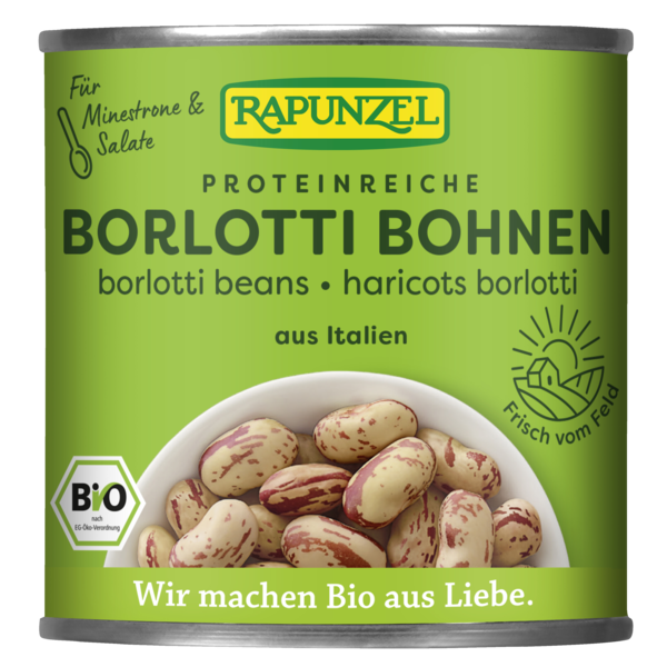 Haricots Borlotti d'Italie, prêts à l'emploi pour une cuisine bio rapide. Les haricots Borlotti sont très aromatiques et ont un léger goût de noisettes. Ils sont particulièrement appréciés dans la cuisine italienne. Ces haricots bruns joliment marbrés sont transformés directement après la récolte dans un délai de 6 heures maximum entre le champ et la mise en conserve. Fraîchement récoltés pour plus de saveur.