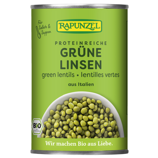 Lentilles vertes prêtes à l'emploi pour une cuisine bio rapide. On évite le temps de trempage et de cuisson puisque les lentilles ont déjà été précuites doucement. Ces petites lentilles vertes au goût de noisette proviennent d'Italie.