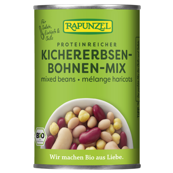 Mélange de haricots rouges Kidney, de haricots d'Espagne, de pois chiches et de haricots blancs Navy. Prêts à l'emploi pour une cuisine bio rapide. On évite le temps de trempage et de cuisson puisque les haricots ont déjà été précuits doucement.