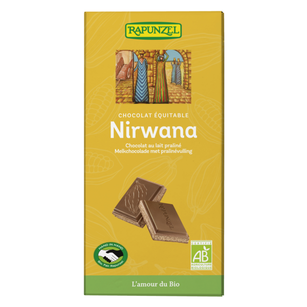Nirwana, le chocolat au lait des gourmets. Fondant, avec un fourrage praliné extrafin. Le chocolat Rapunzel est synonyme de grande qualité dans le respect de la fabrication traditionnelle suisse associée à de précieux ingrédients issus de l'agriculture biologique et du commerce équitable. Avec les matières premières de qualité, le conchage intensif est le véritable secret de ce délicieux chocolat. Grâce au conchage, les riches arômes cacaotés se libèrent petit à petit jusqu'à leur plein épanouissement. Et toute la subtilité et le fondant incomparable du chocolat se dévoilent.