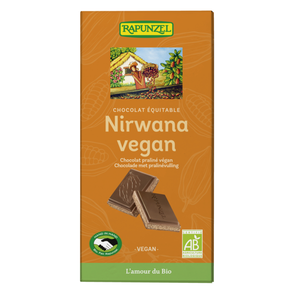 Nirwana végan est le chocolat de tous les gourmets et se passe complètement de poudre de lait. Le subtil fourrage praliné fond doucement sur la langue. Le chocolat Rapunzel est synonyme de grande qualité dans le respect de la fabrication traditionnelle suisse associée à de précieux ingrédients issus de l'agriculture biologique et du commerce équitable. Avec les matières premières de qualité, le conchage intensif est le véritable secret de ce délicieux chocolat. Grâce au conchage, les riches arômes cacaotés se libèrent petit à petit jusqu'à leur plein épanouissement. Et toute la subtilité et le fondant incomparable du chocolat se dévoilent.