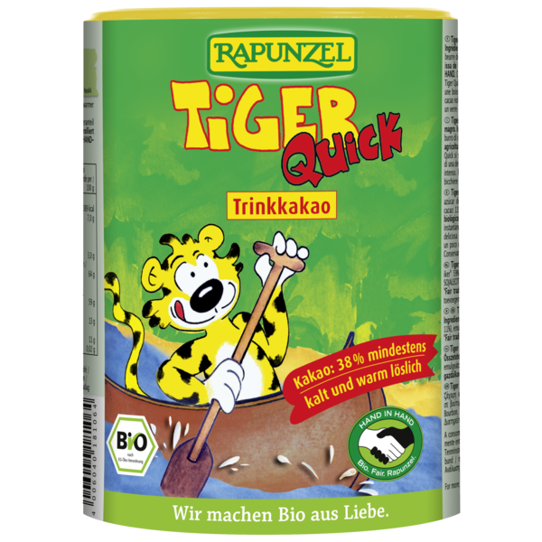 Boisson cacaotée Tiger Quick - issue du programme HAND IN HAND de Rapunzel qui allie écologie et commerce équitable. Merveilleusement chocolatée grâce à la teneur très élevée en cacao (38%). La poudre se dissout parfaitement dans le lait chaud ou froid.