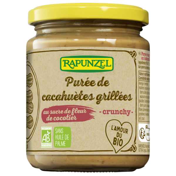 Rapunzel dispose d'un savoir-faire de presque 50 ans pour l'élaboration des purées de fruits à coque. Tout l'arôme des cacahuètes est libéré grâce à une torréfaction douce à air chaud. Elles sont ensuite moulues grossièrement avec le sucre de fleur de cocotier et les épices. Une production soignée vous garantit ce goût unique.