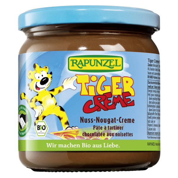 Des noisettes fraîchement grillées, du cacao savoureux et du lait entier font de la pâte à tartiner Tiger'' un délice onctueux et chocolaté. La poudre de cacao, le sucre de canne Cristallino et l'huile de palme sont issus du commerce équitable et fournis par nos partenaires HAND IN HAND. La consistance de cette pâte à tartiner dépend de la température. Elle sera onctueuse à température ambiante et solide si conservée dans le réfrigérateur.''