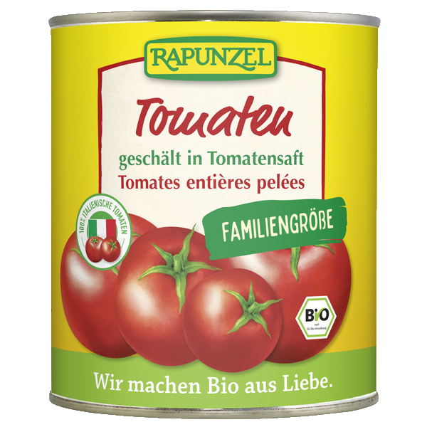 Goût délicieusement aromatique et fruité. 100% tomates italiennes mûries au soleil. Les tomates entières sont pelées et conservées dans un délicieux jus de tomates. Elles sont prêtes à l'emploi, il suffit de les réchauffer rapidement avant de servir.